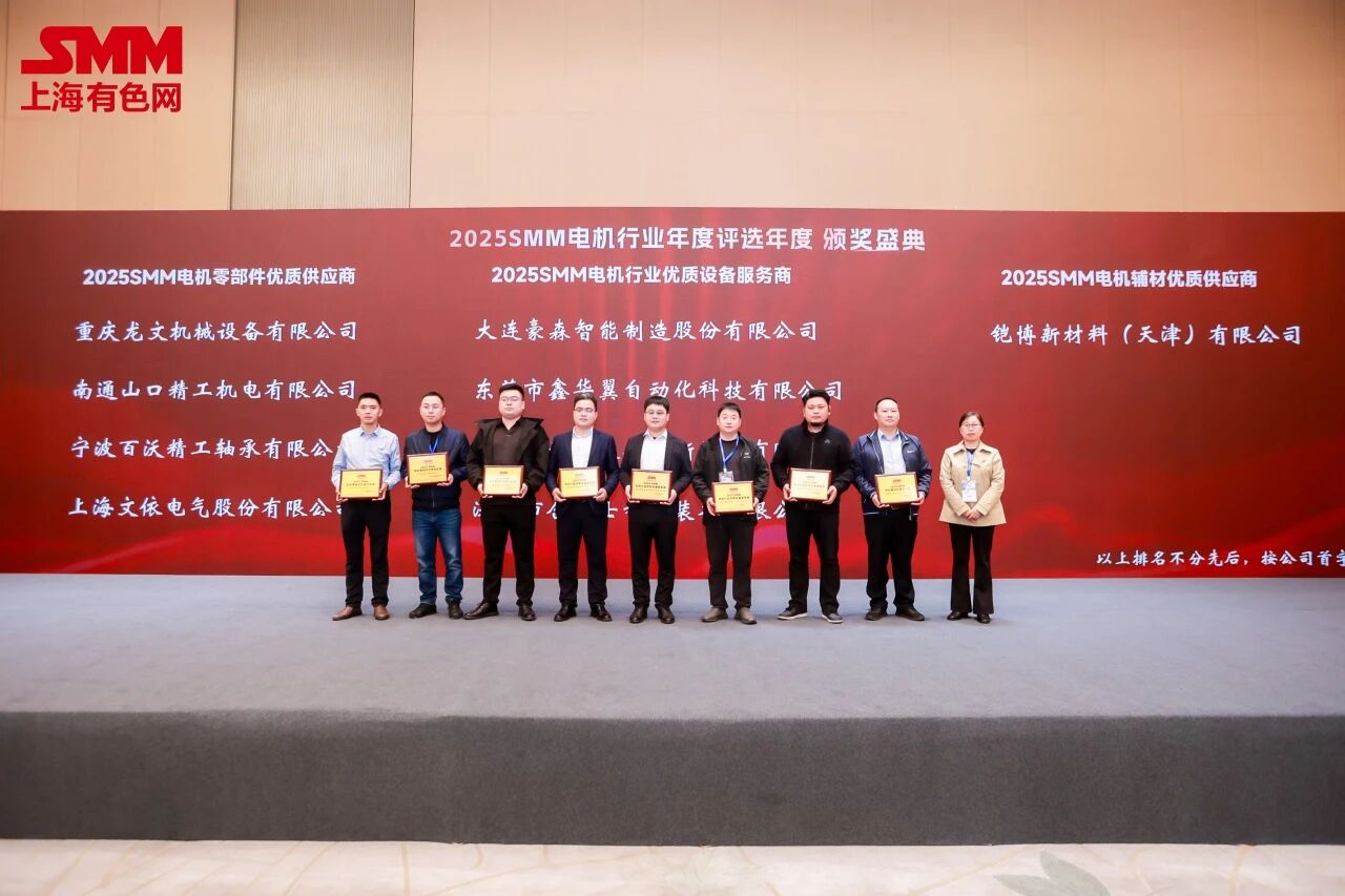 2025年11月12-14日,在由上海有色網(wǎng)信息科技股份有限公司(SMM)主辦,寧波招寶磁業(yè)股份有限公司總冠名的SMM 2025IEMC(第五屆)電機(jī)年會(huì)暨產(chǎn)業(yè)鏈博覽會(huì)在浙江·寧波國(guó)際會(huì)議中心舉行。期間,舉辦了優(yōu)質(zhì)供應(yīng)商頒獎(jiǎng)儀式,文依電氣獲評(píng)“2025SMM電機(jī)零部件優(yōu)質(zhì)供應(yīng)商”。
