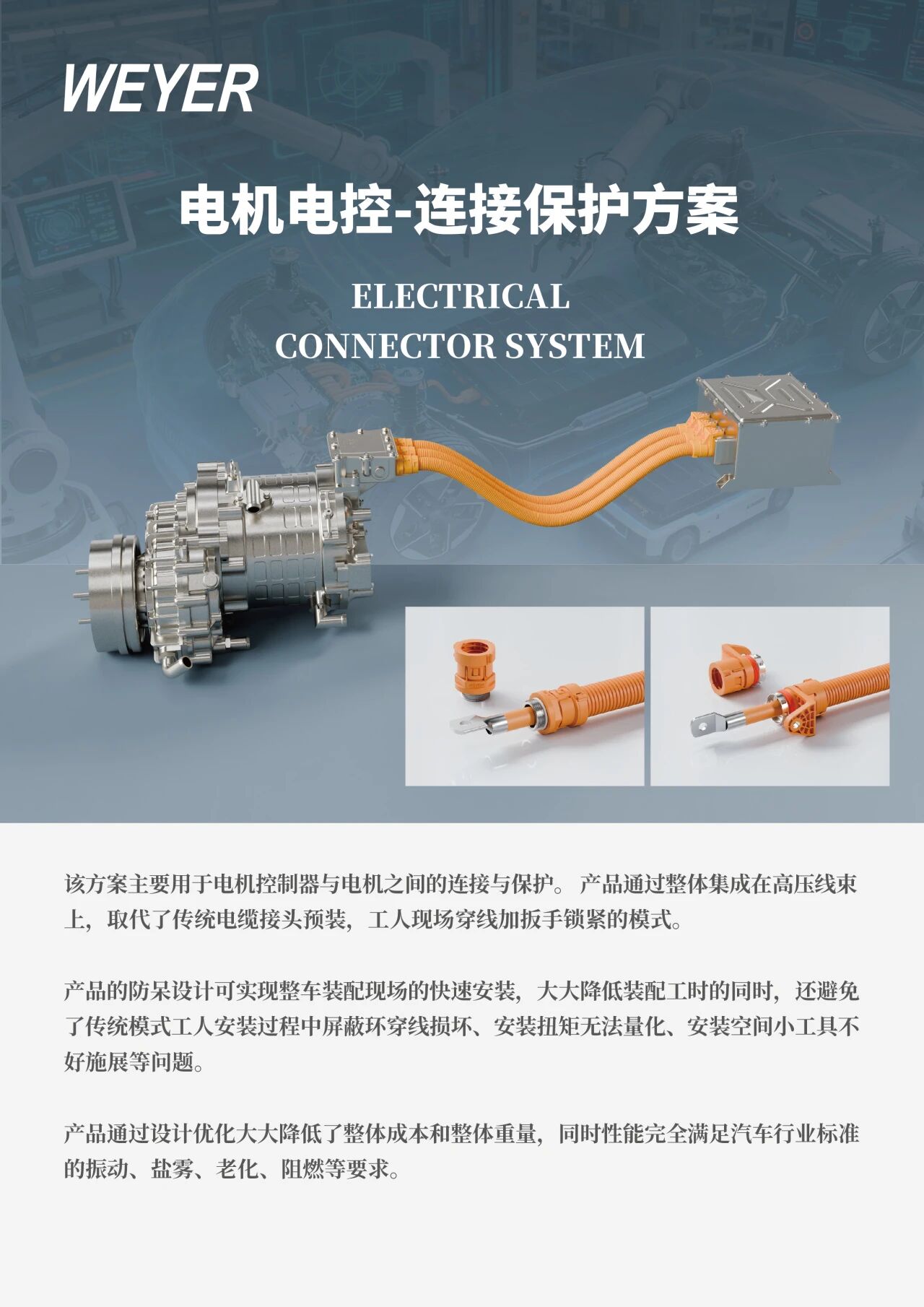 在此次博覽會(huì)上,文依電氣同步重磅推出兩款擁有自主知識(shí)產(chǎn)權(quán)的連接器新品 ——WQC014 L型連接器與WQC015 單芯過(guò)孔連接器。兩款產(chǎn)品均具備快速安裝、屏蔽功能卓越、防護(hù)等級(jí)達(dá)IP68的核心優(yōu)勢(shì);其中 WQC014尾部可固定波紋管,WQC015尾部可選卡波紋管,二者均適配電機(jī)、電機(jī)控制器等應(yīng)用場(chǎng)景,為電機(jī)領(lǐng)域連接系統(tǒng)的高效化、可靠化提供了創(chuàng)新解決方案,進(jìn)一步展現(xiàn)了文依電氣在電機(jī)零部件領(lǐng)域的技術(shù)深耕與創(chuàng)新實(shí)力。